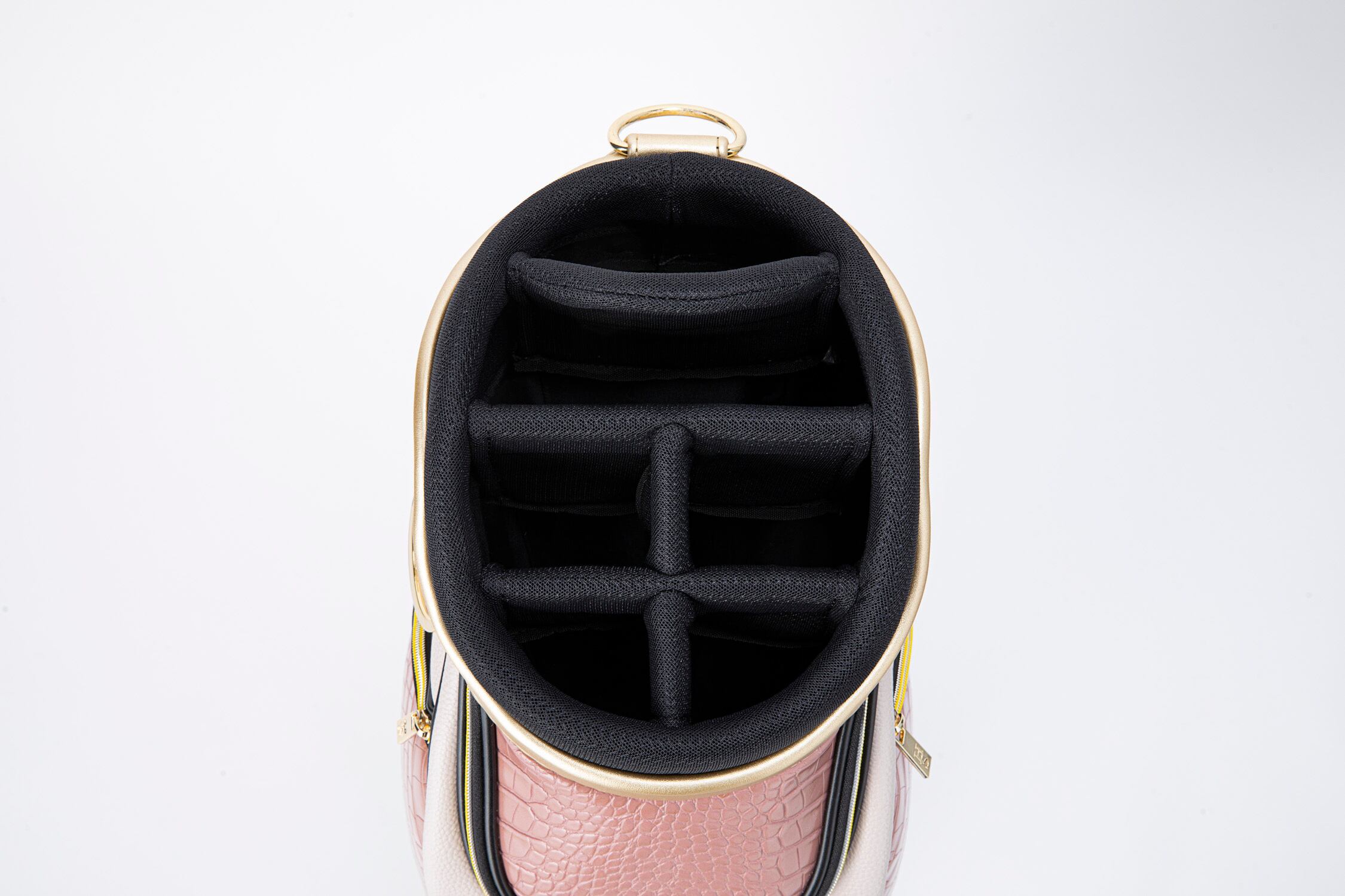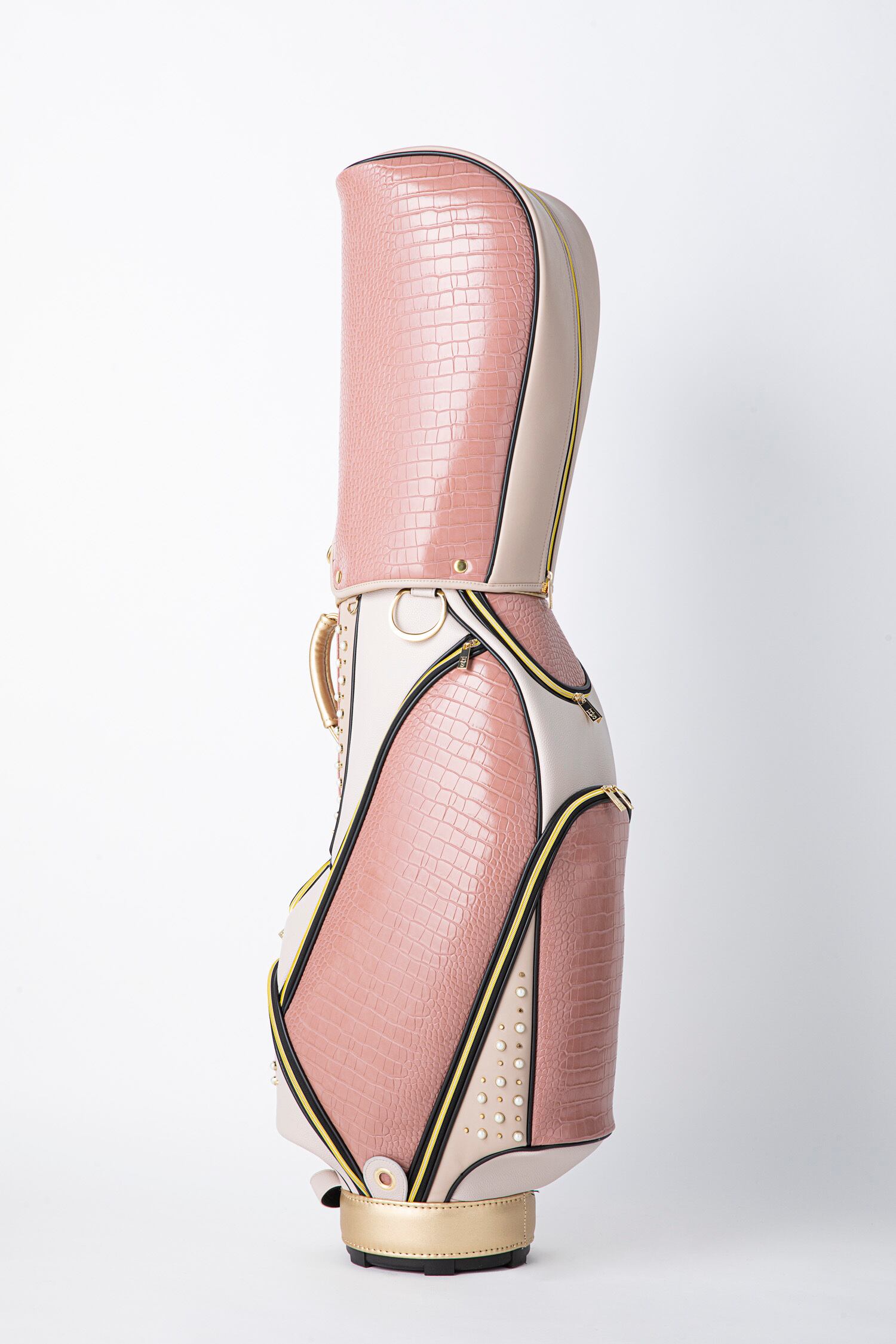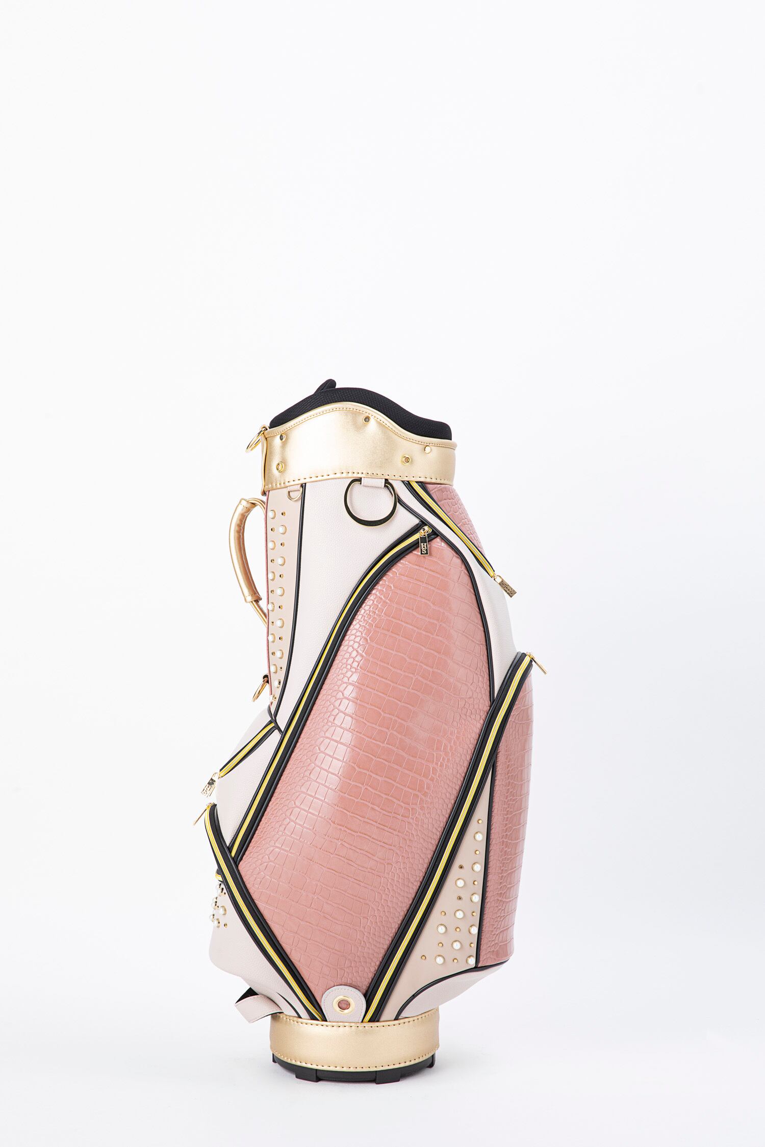 耐久性のある合皮にリアルなクロコダイルの型押しをしたカートタイプキャディバッグ。
