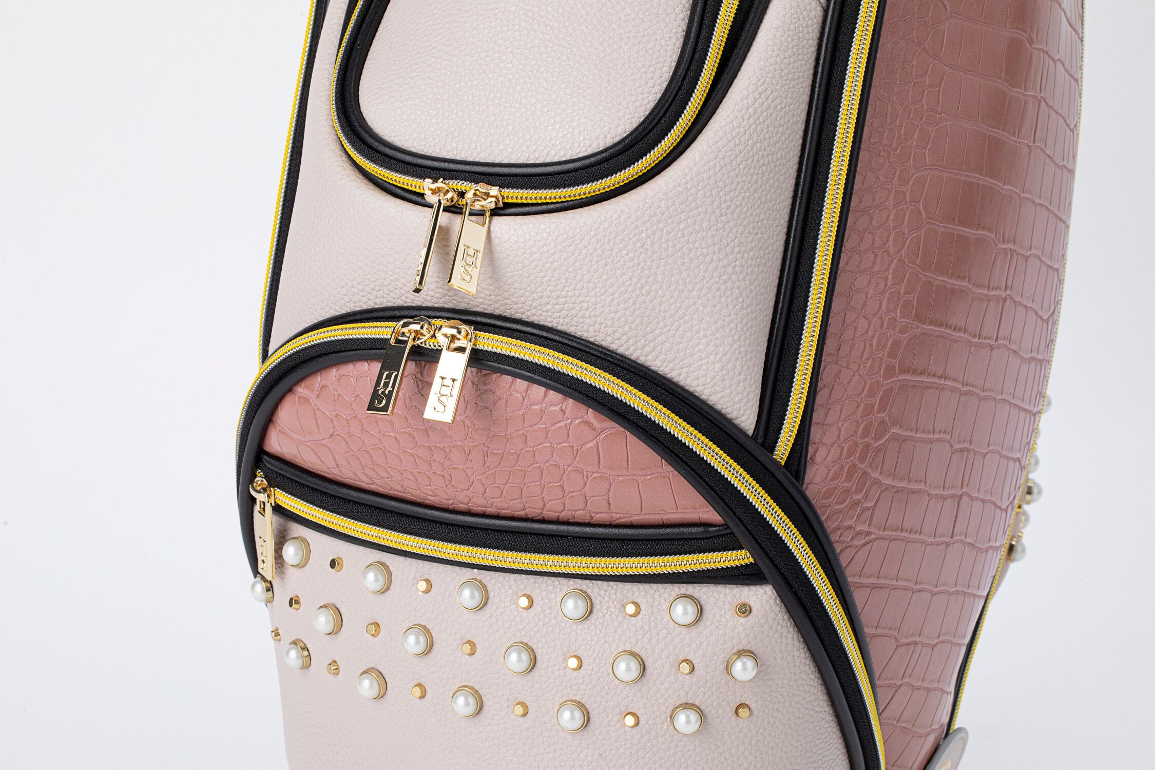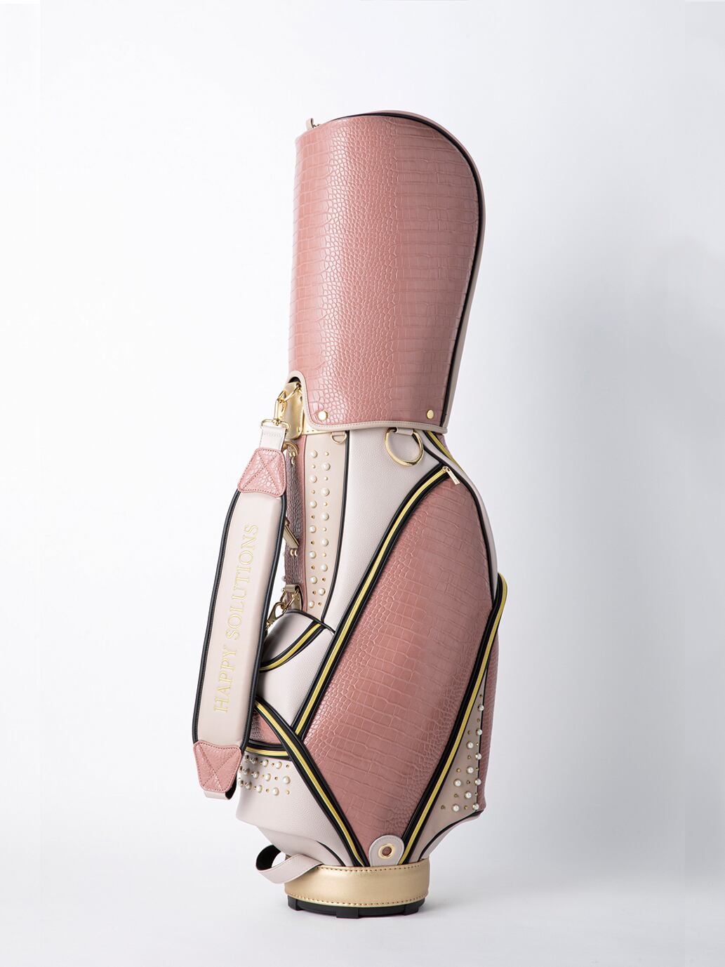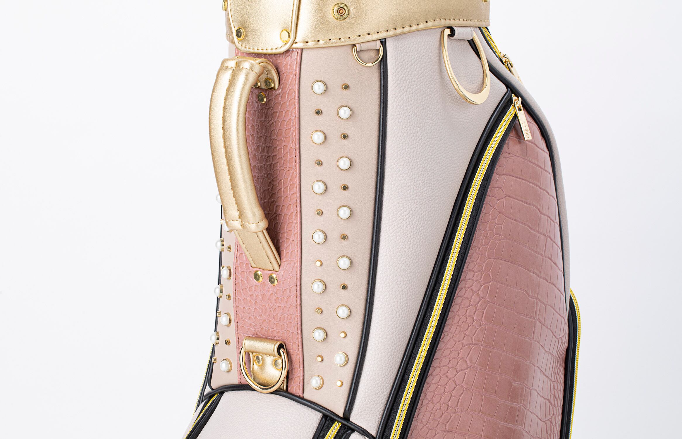 耐久性のある合皮にリアルなクロコダイルの型押しをしたカートタイプキャディバッグ。